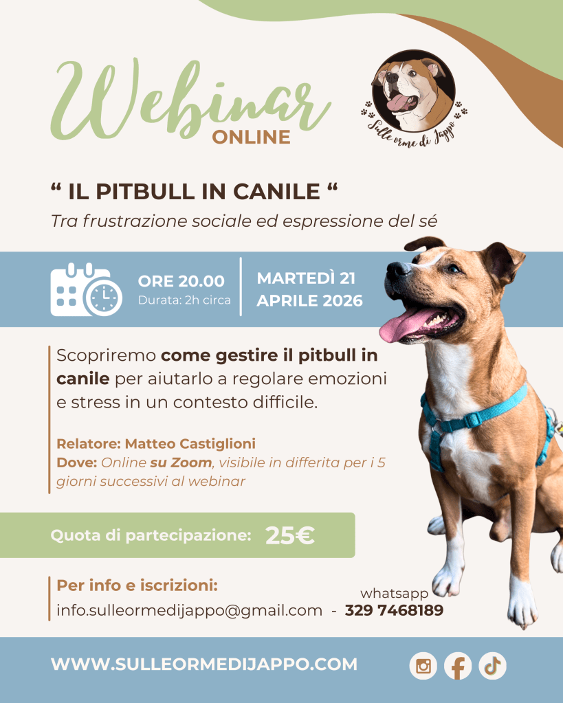 👉 Il webinar è pensato per educatori, volontari e appassionati che vogliono conoscere le esigenze specifiche dei pitbull in contesti di canile e imparare strumenti concreti per ridurre stress e frustrazione.
